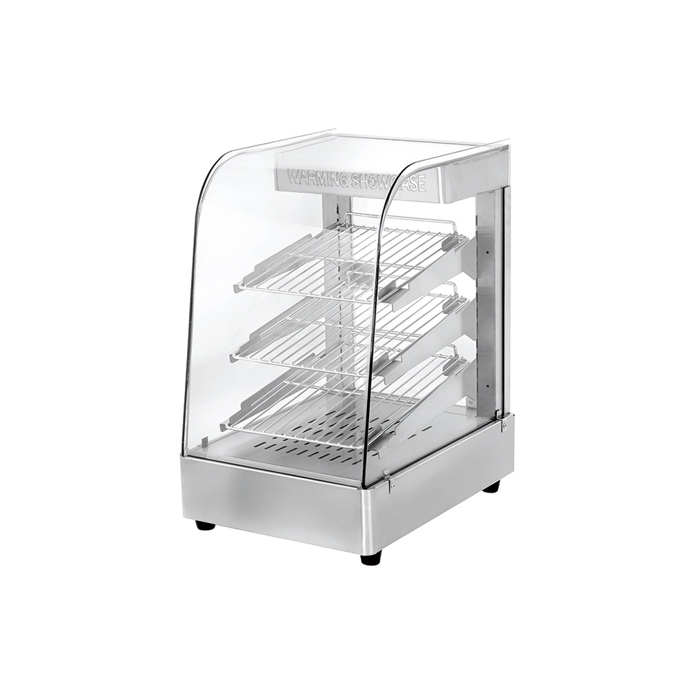 Bemutató melegentartó vitrin pultra helyezhető hajlított üveges, 3 polccal, 35 cm széles
