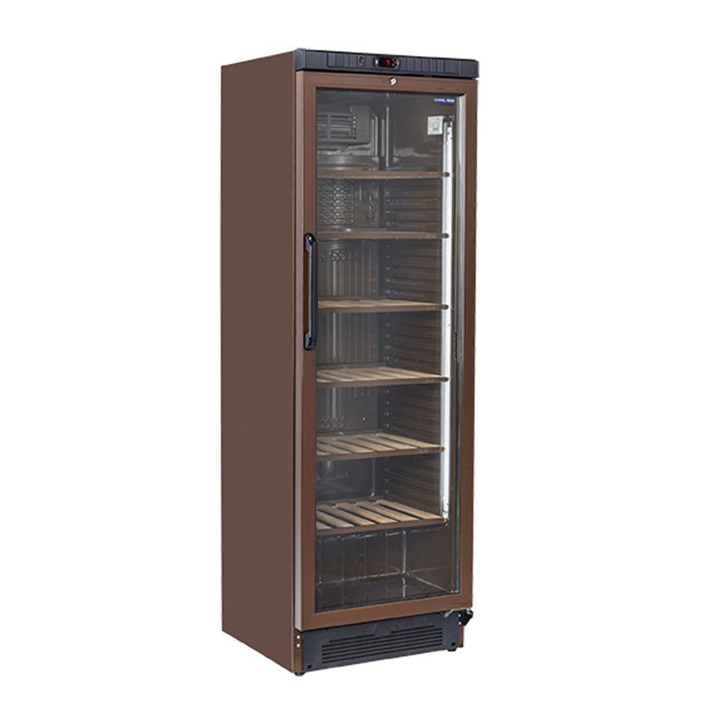 Borhűtő szabadonálló hűtő vitrin barna 350 literes 6 szintes fa polccal LED világítással ipari