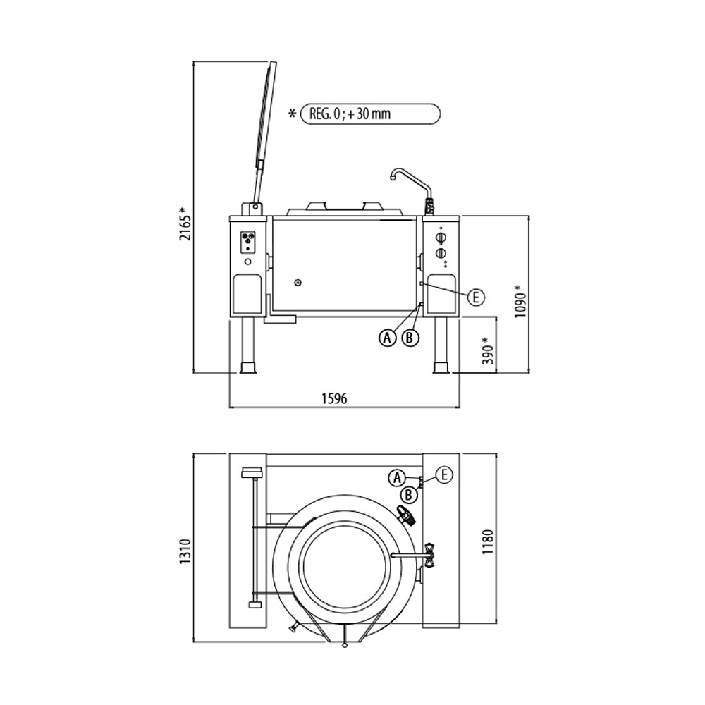 • Hideg- és melegvízcsapok csuklós kifolyóval a munkafelületre szerelve a tartály és a köztes köpeny feltöltésére és öblítésére.