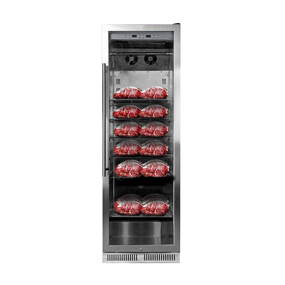 Az érintőképernyős kezelőpanelnek köszönhetően minden beállítás könnyen elvégezhető, és a szabályozható hőmérsékleten, páratartalommal és ventilációval az érési folyamat néhány héten belül automatikusan lezajlik a készülékben. A beépített UVC-rendszer biztosítja a belső antibakteriális tisztaságot, garantálva, hogy semmi sem károsítja az értékes húsdarabokat.