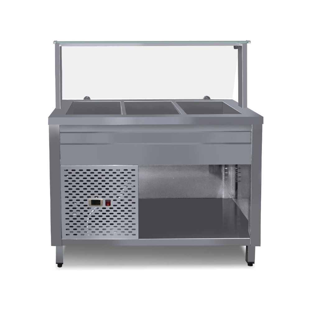 Hűtőpult 3xGN1/1 alsó hűtött tárolóval egyenes üveges felépítménnyel köztes üvegpolccal 1150 mm ipari