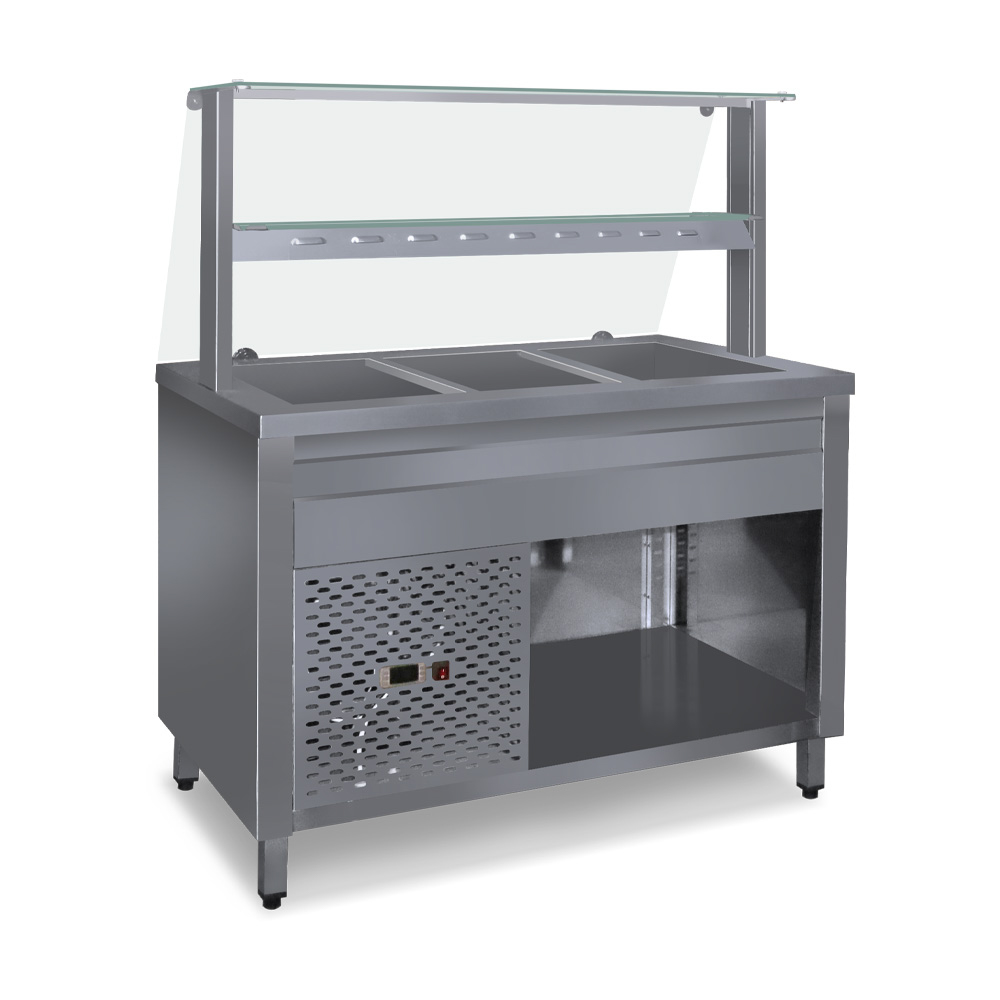 Hűtőpult 3xGN1/1 alsó hűtött tárolóval egyenes üveges felépítménnyel köztes üvegpolccal 1150 mm ipari