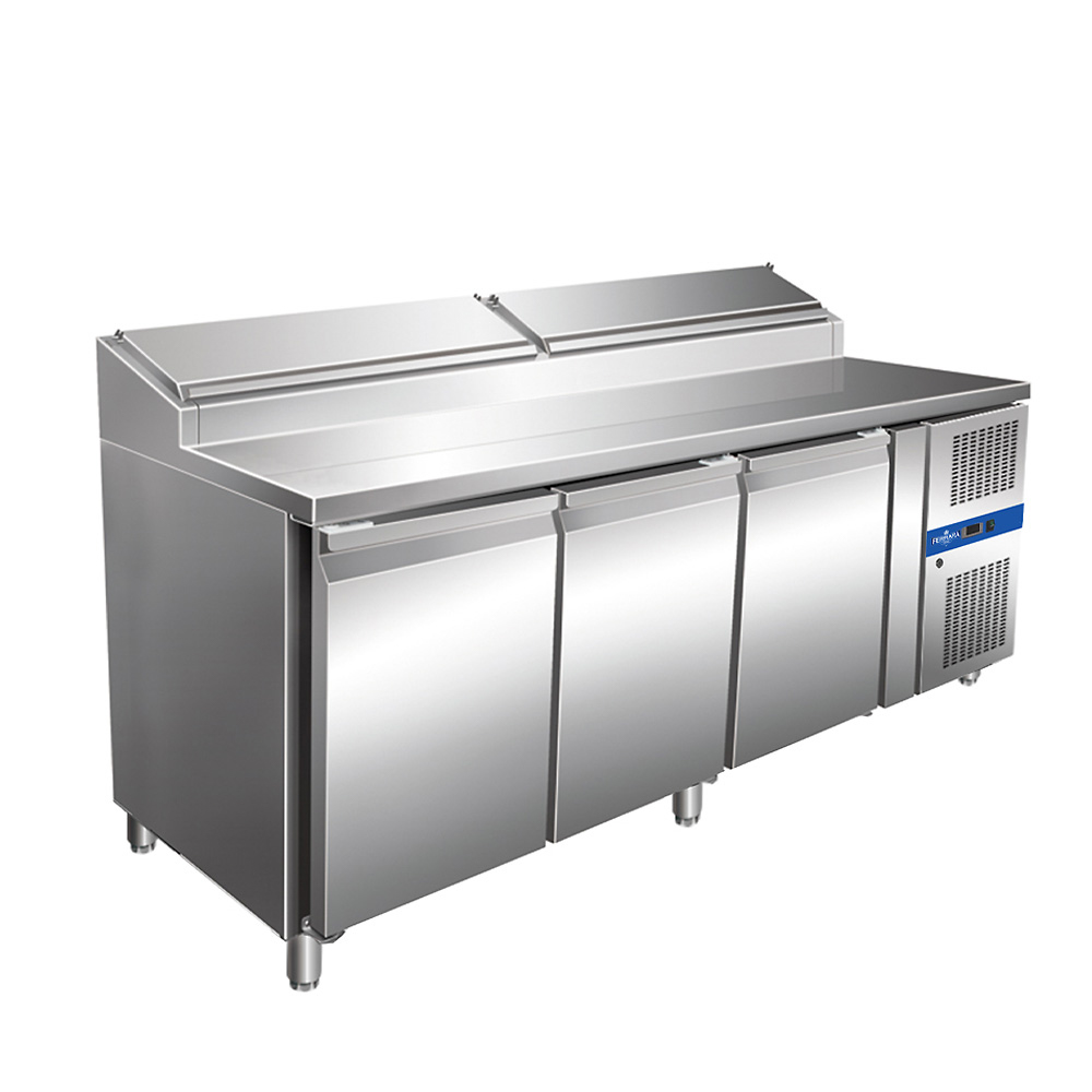 Hűtött munkaasztal felnyitható 10×GN1/3-as feltéthűtővel 3 ajtós pékipari méret
