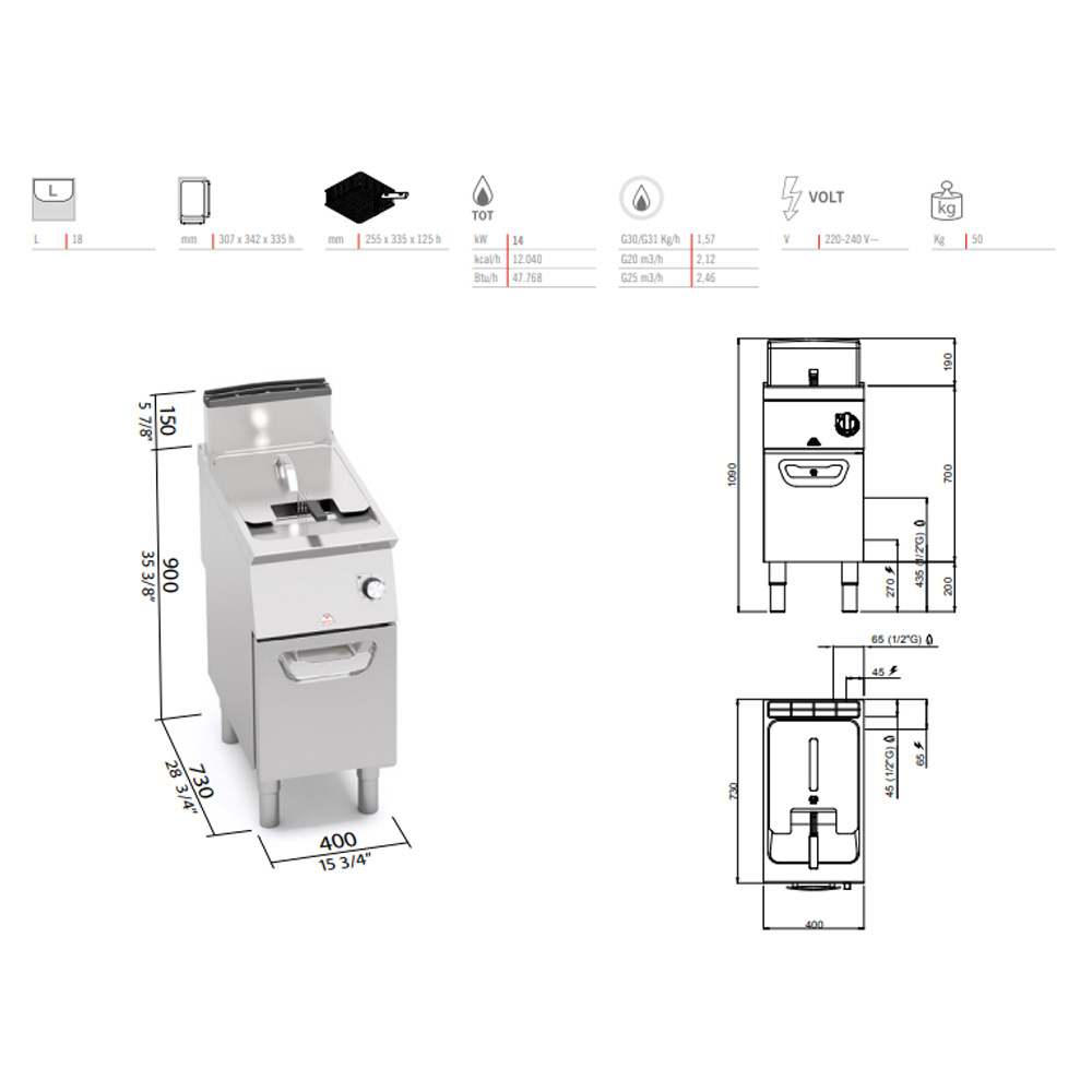 • Munkalap AISI 304 rozsdamentes acélból 20/10 vastagságban, elülső és oldalsó panelek AISI 304 rozsdamentes acélból és scott brite bevonattal.