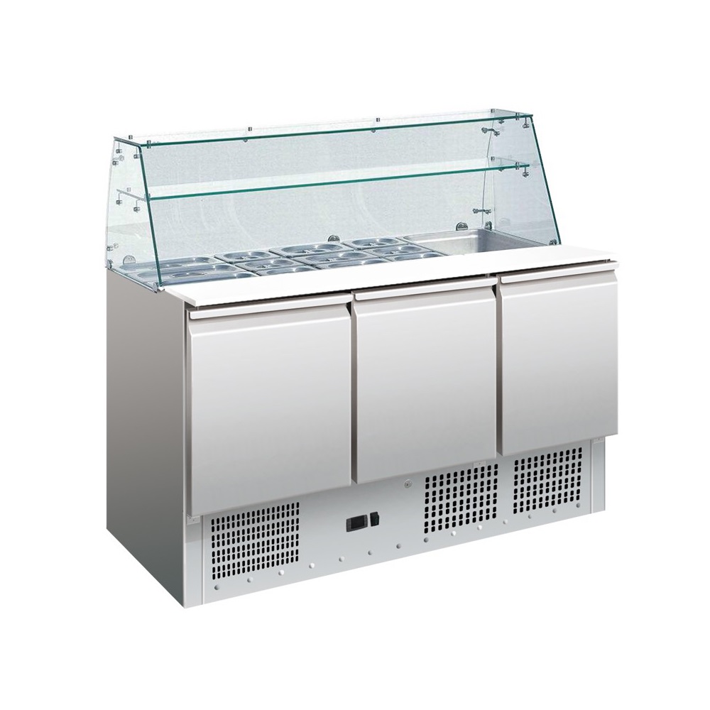 Salátahűtő bemutató hűtő 3 ajtós hajlított üveg felépítménnyel ipari 400 liter